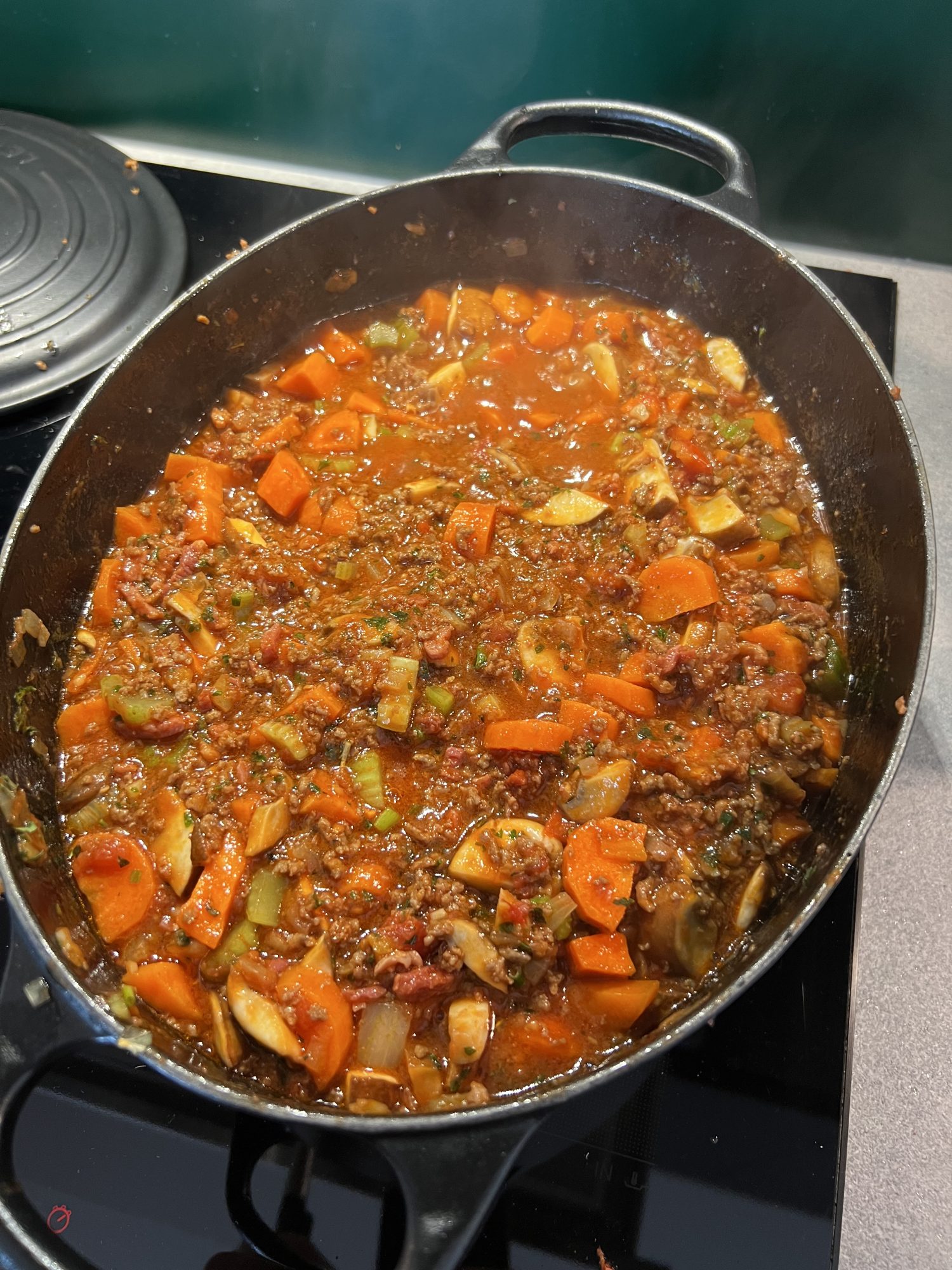voeg de gehakt toe en bak deze rul. De gehakt hoeft niet geheel gaar te zijn, de saus kookt voor een langere tijd die ervoor zorgt dat alles gaar is.